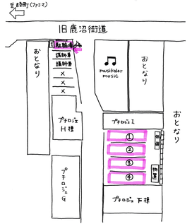 ムジコロアミュージック駐車場を地図の通りに移動しました。お間違えの無いようお願い致します。